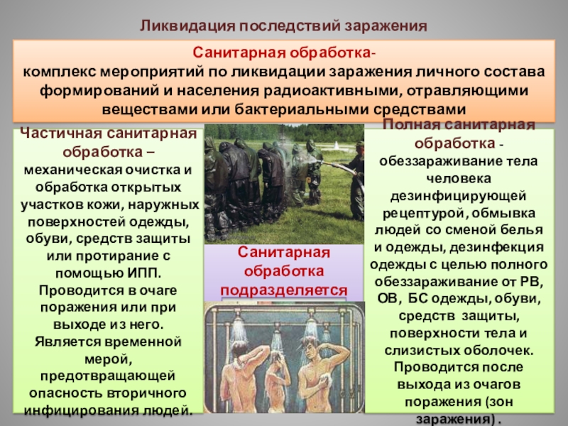 Полная санитарная обработка - обеззараживание тела человека дезинфицирующей рецептурой, обмывка людей со сменой белья и одежды, дезинфекция одежды с целью полного обеззараживание от РВ, ОВ, БС одежды, обуви, средств защиты, поверхности тела и слизистых оболочек. Проводится после выхода из очагов поражения (зон заражения) .
