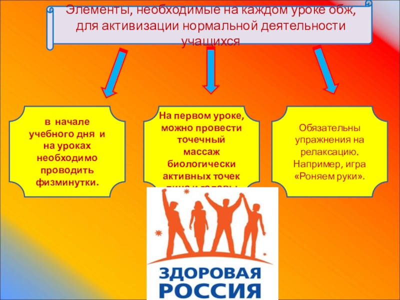 Обязательны упражнения на релаксацию. Например, игра «Роняем руки».