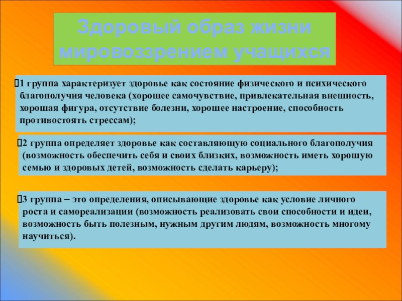 3 группа – это определения, описывающие здоровье как условие личного роста и самореализации (возможность реализовать свои способности и идеи, возможность быть полезным, нужным другим людям, возможность многому научиться).