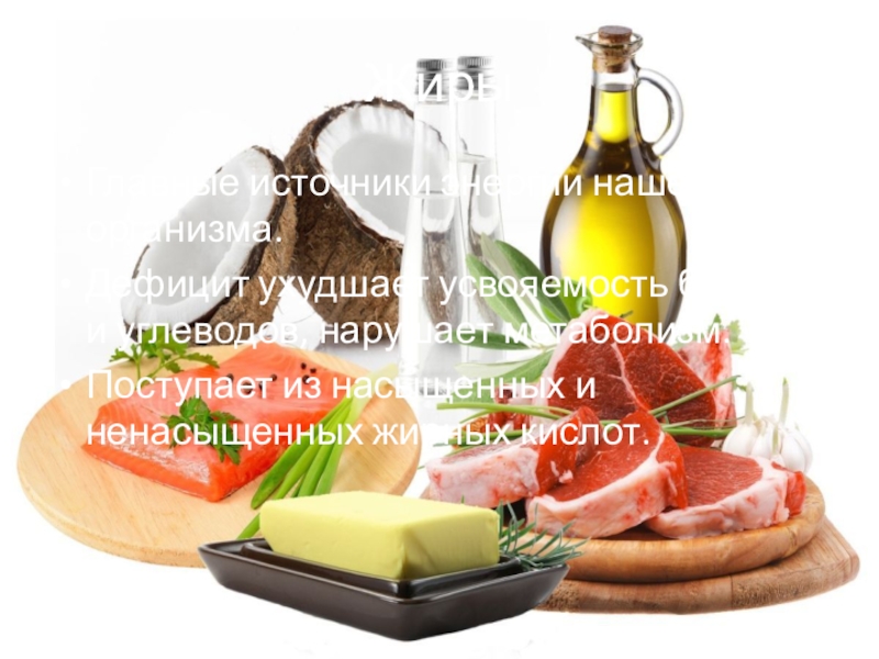 ЖирыГлавные источники энергии нашего организма.Дефицит ухудшает усвояемость белков и углеводов, нарушает метаболизм.Поступает из насыщенных и ненасыщенных жирных