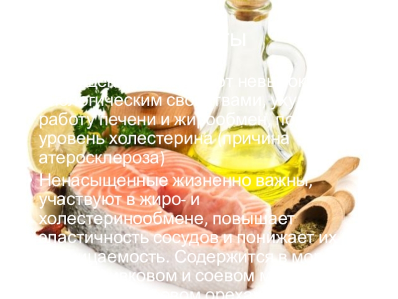 КислотыНасыщенные обладают невысокими биологическим свойствами, ухудшают работу печени и жирообмен, повышают уровень холестерина (причина атеросклероза)Ненасыщенные жизненно важны,