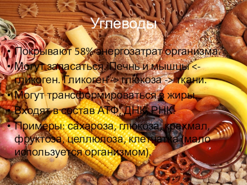 УглеводыПокрывают 58% энергозатрат организма.Могут запасаться. Печнь и мышцы глюкоза -> ткани.Могут трансформироваться в жиры.Входят в состав АТФ,