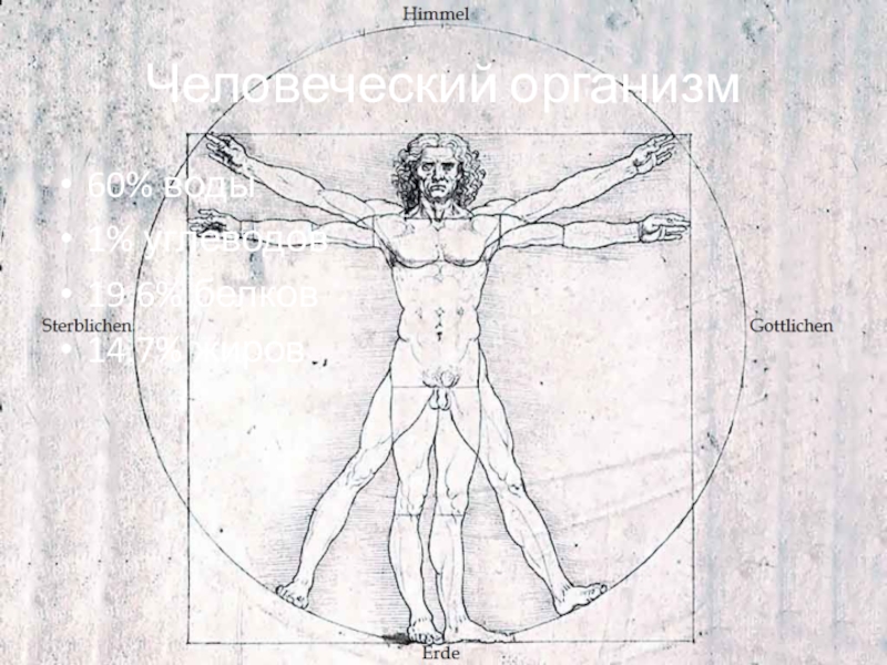 Человеческий организм60% воды1% углеводов19.6% белков14.7% жиров