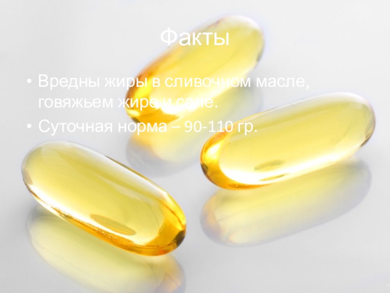 ФактыВредны жиры в сливочном масле, говяжьем жире и сале.Суточная норма – 90-110 гр.
