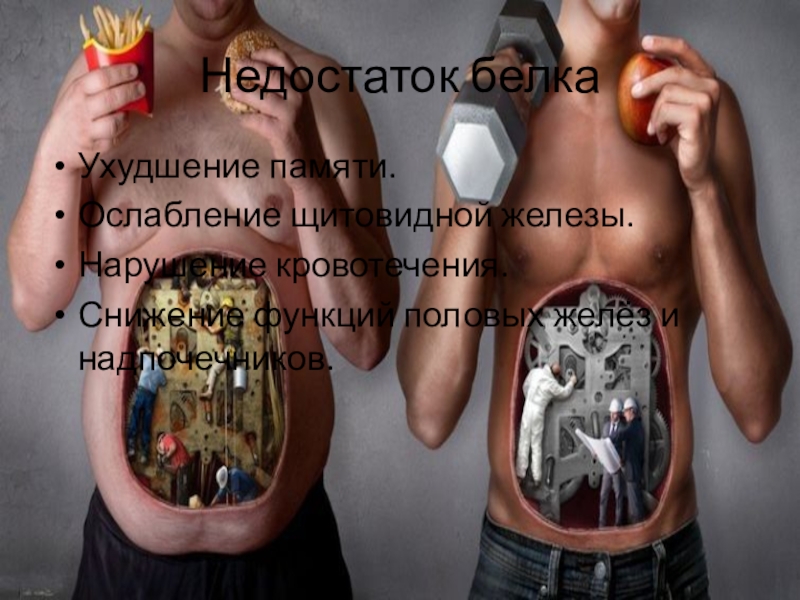 Недостаток белкаУхудшение памяти.Ослабление щитовидной железы.Нарушение кровотечения.Снижение функций половых желёз и надпочечников.