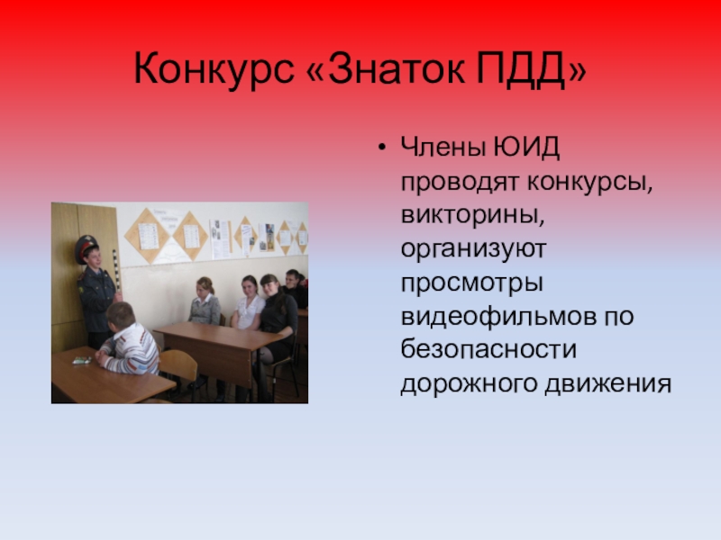 Члены ЮИД проводят конкурсы, викторины, организуют просмотры видеофильмов по