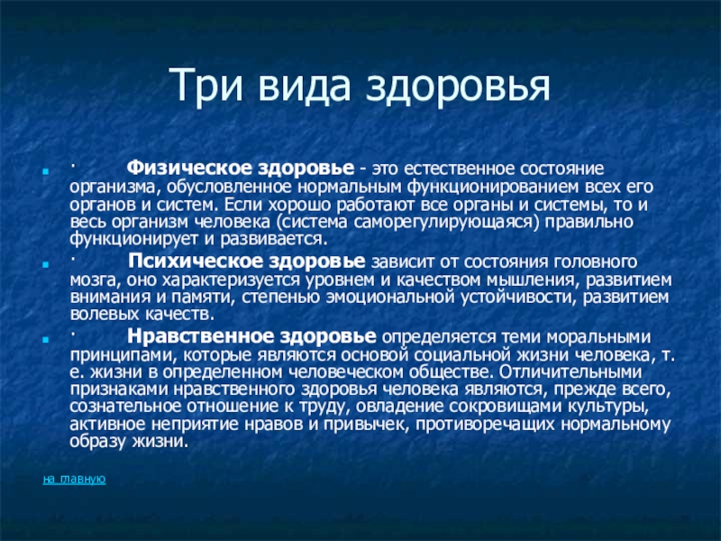· Нравственное здоровье определяется теми моральными принципами, которые являются основой социальной жизни человека, т.е. жизни в определенном человеческом обществе. Отличительными признаками нравственного здоровья человека являются, прежде всего, сознательное отношение к труду, овладение сокровищами культуры, активное неприятие нравов и привычек, противоречащих нормальному образу жизни.