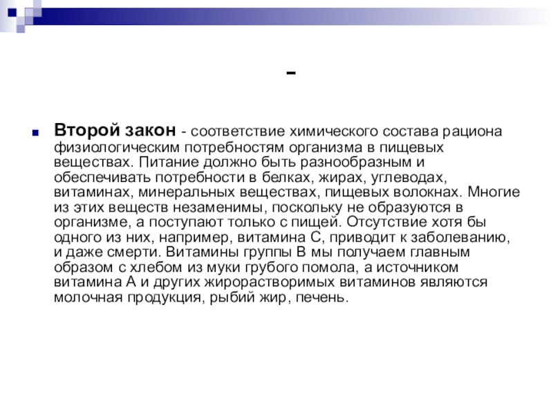 Второй закон - соответствие химического состава рациона физиологическим потребностям организма в пищевых веществах. Питание должно быть разнообразным и обеспечивать потребности в белках, жирах, углеводах, витаминах, минеральных веществах, пищевых волокнах. Многие из этих веществ незаменимы, поскольку не образуются в организме, а поступают только с пищей. Отсутствие хотя бы одного из них, например, витамина С, приводит к заболеванию, и даже смерти. Витамины группы В мы получаем главным образом с хлебом из муки грубого помола, а источником витамина А и других жирорастворимых витаминов являются молочная продукция, рыбий жир, печень.