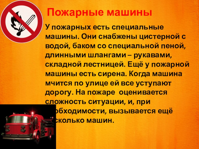 баком со специальной пеной, длинными шлангами – рукавами, складной лестницей. Ещё у пожарной машины есть сирена. Когда машина мчится по улице ей все уступают дорогу. На пожаре оценивается сложность ситуации, и, при необходимости, вызывается ещё несколько машин.