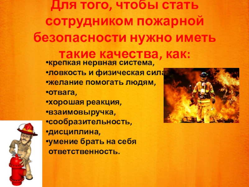Слайд 5Для того, чтобы стать сотрудником пожарной безопасности нужно иметь такие качества,