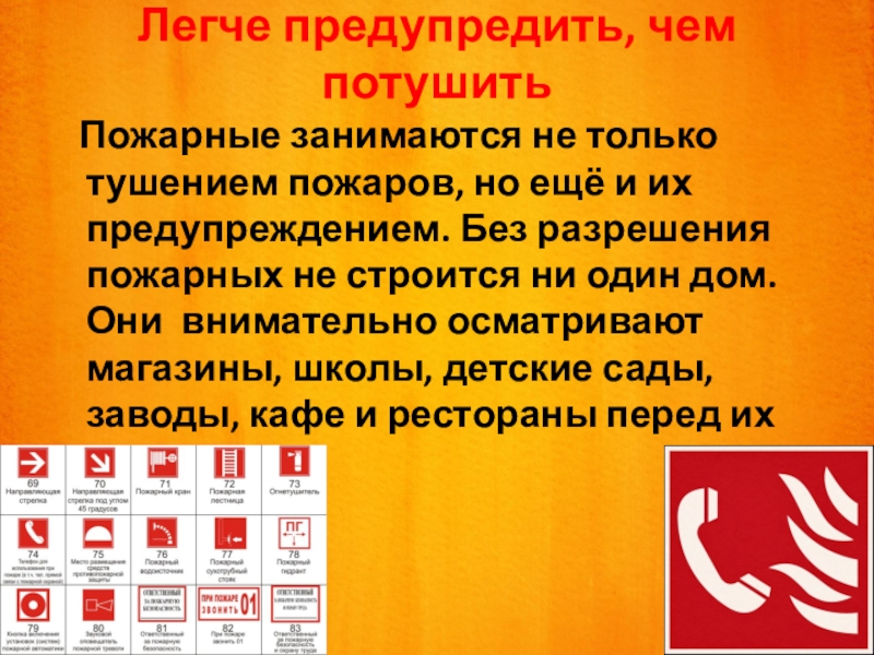 но ещё и их предупреждением. Без разрешения пожарных не строится ни один дом. Они внимательно осматривают магазины, школы, детские сады, заводы, кафе и рестораны перед их открытием.