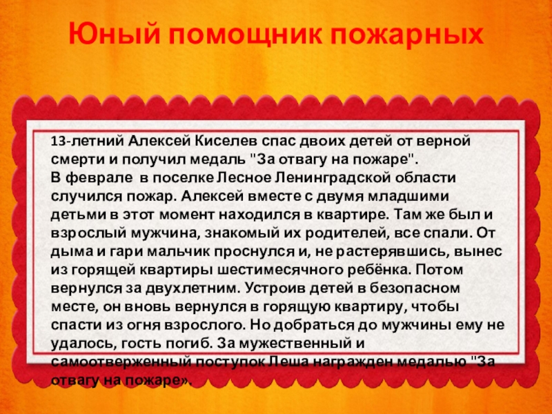 В феврале в поселке Лесное Ленинградской области случился пожар. Алексей вместе с двумя младшими детьми в этот момент находился в квартире. Там же был и взрослый мужчина, знакомый их родителей, все спали. От дыма и гари мальчик проснулся и, не растерявшись, вынес из горящей квартиры шестимесячного ребёнка. Потом вернулся за двухлетним. Устроив детей в безопасном месте, он вновь вернулся в горящую квартиру, чтобы спасти из огня взрослого. Но добраться до мужчины ему не удалось, гость погиб. За мужественный и самоотверженный поступок Леша награжден медалью "За отвагу на пожаре».