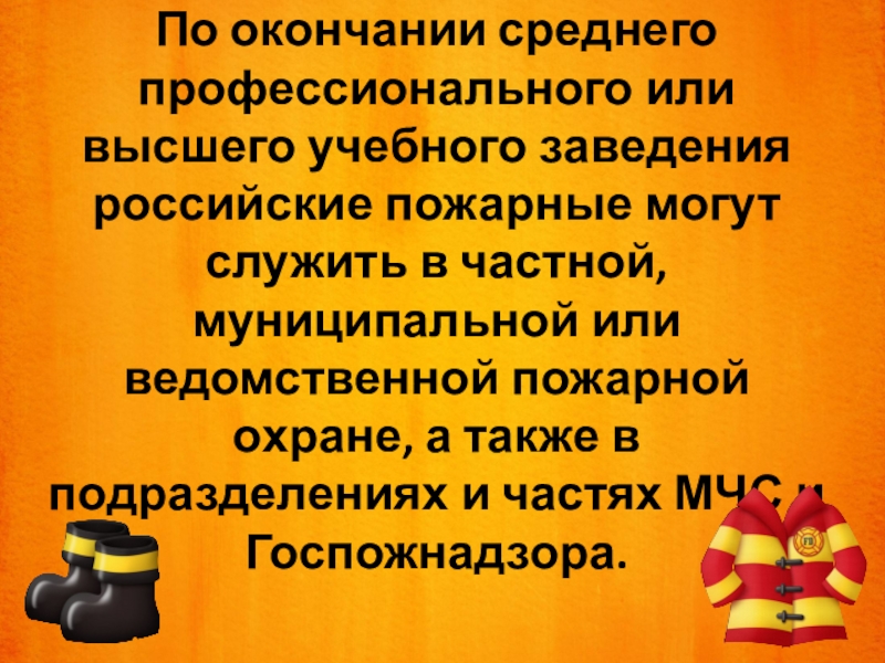 Слайд 8По окончании среднего профессионального или высшего учебного заведения российские пожарные могут