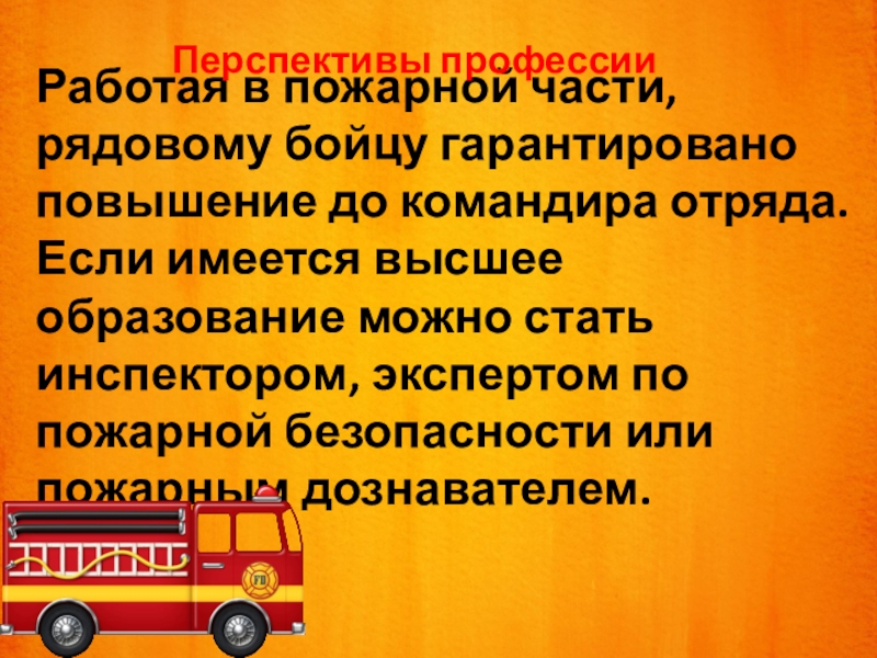 Слайд 7Работая в пожарной части, рядовому бойцу гарантировано повышение до командира отряда.