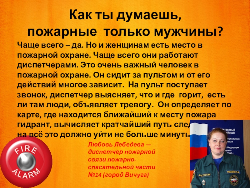 женщинам есть место в пожарной охране. Чаще всего они работают диспетчерами. Это очень важный человек в пожарной охране. Он сидит за пультом и от его действий многое зависит. На пульт поступает звонок, диспетчер выясняет, что и где горит, есть ли там люди, объявляет тревогу. Он определяет по карте, где находится ближайший к месту пожара гидрант, вычисляет кратчайший путь следования. И на всё это должно уйти не больше минуты.