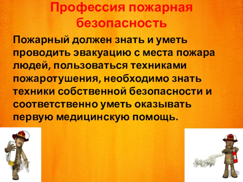 пожара людей, пользоваться техниками пожаротушения, необходимо знать техники собственной безопасности и соответственно уметь оказывать первую медицинскую помощь.