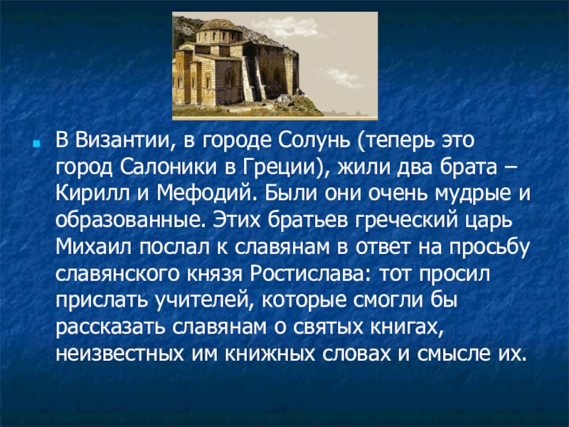 В Византии, в городе Солунь (теперь это город Салоники в Греции), жили два брата – Кирилл и