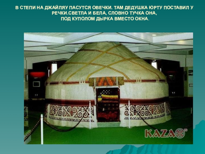 Слайд 14В СТЕПИ НА ДЖАЙЛЯУ ПАСУТСЯ ОВЕЧКИ. ТАМ ДЕДУШКА ЮРТУ ПОСТАВИЛ У