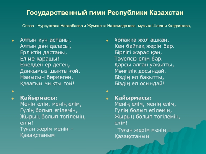 Слова - Нурсултана Назарбаева и Жумекена Нажимеденова, музыка
