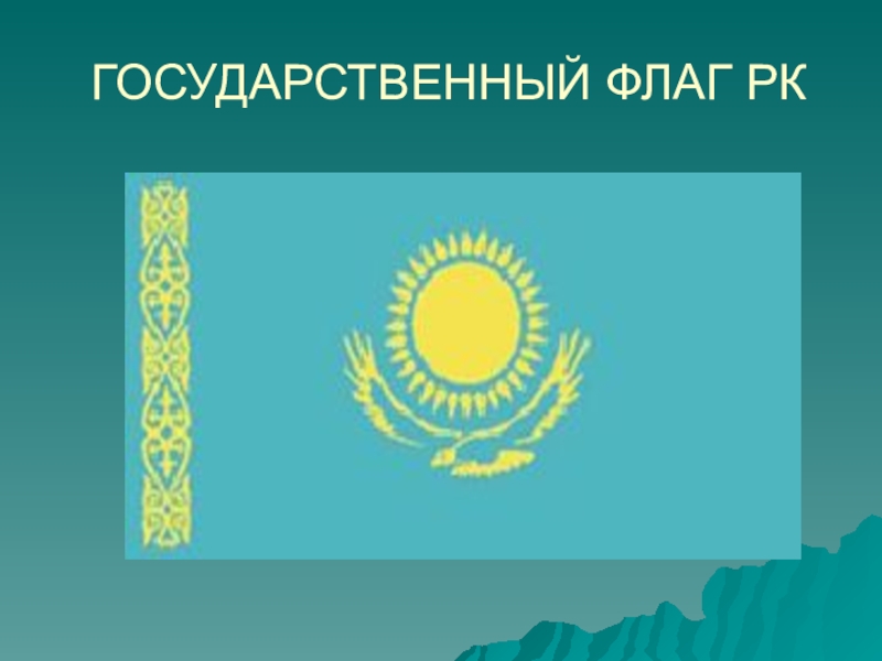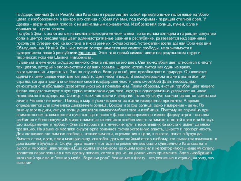 Главным элементом государственного флага является его цвет. Светло-голубой цвет относится к числу тех цветов, который человечеством с давних времен широко используется как один из ярких, выразительных и приятных. Это не случайно. Ведь данный цвет преобладает в природе. Он является одним из семи священных цветов радуги. Цвет неба и воды. В международном плане к политике той страны, которая подняла символом своей государственности светло-голубой флаг, необходимо относиться с наибольшей доверительностью и пониманием. Таким образом, чистый голубой цвет нашего флага свидетельствует о культурно-этническом единстве народа и одновременно указывает на идею неделимости государства. Солнце - источник жизни и энергии. Поэтому силуэт солнца является символом жизни. Человек не вечен. Приход в мир и уход человека из жизни измеряется временем. А время определяется для кочевника движением солнца. Восход и заход солнца, одно измерение - день. По закону геральдики, силуэт солнца является символом богатства и изобилия. Поэтому не случайно при внимательном рассмотрении лучи солнца в нашем флаге одновременно имеют форму зерна - основы изобилия и благополучия.В миропонимании кочевников особое место занимает степной орел или беркут. Его изображение в гербах и флагах народов и этнических групп, населявших Казахстан, имеет давнюю традицию. На языке символики силуэт орла означает государственную власть, широту и прозорливость. Для степняков это символ свободы, независимости, стремления к цели, к высоте, полет в будущее. Вместе с тем, орел, имея мощную силу, способен дать достойный отпор любому, кто пытается помешать в достижении будущего. Силуэт орла возник и от идеи стремления молодого суверенного Казахстана в высоты мировой цивилизации.Еще одним элементом, дающим новизну и неповторимость нашему флагу, является параллельная к его древку полоса, состоящая из национального орнамента. Здесь изображен казахский орнамент "кошкар-муйз - бараньи рога". Уважение к флагу - это уважение к стране, народу, его истории.