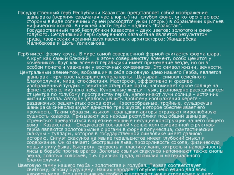 юрты) на голубом фоне, от которого во все стороны в виде солнечных лучей расходятся уыки (опоры) в обрамлении крыльев мифических коней. В нижней части герба - надпись "Казакстан". Государственный герб Республики Казахстан - двух цветов: золотого и сине-голубого. Сегодняшний герб суверенного Казахстана является результатом труда, творческих исканий двух известных архитекторов: Жандарбека Малибекова и Шоты Уалиханова.