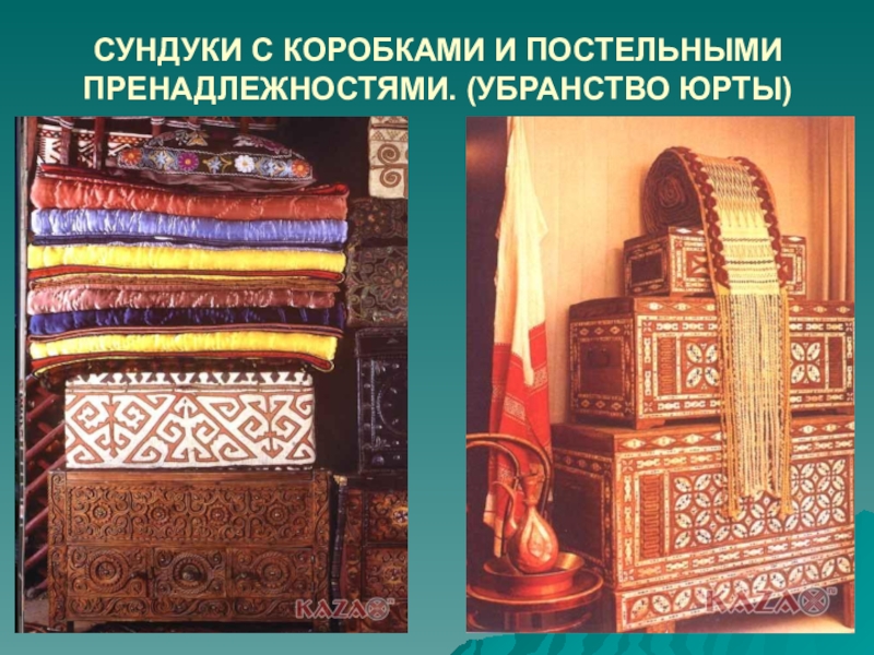 Слайд 16СУНДУКИ С КОРОБКАМИ И ПОСТЕЛЬНЫМИ ПРЕНАДЛЕЖНОСТЯМИ. (УБРАНСТВО ЮРТЫ)