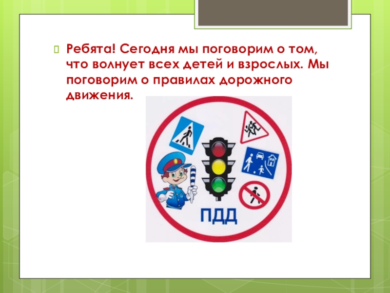 Ребята! Сегодня мы поговорим о том, что волнует всех детей и взрослых. Мы поговорим о правилах дорожного движения.