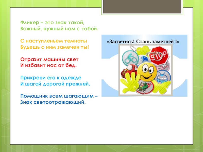 Фликер – это знак такой,Важный, нужный нам с тобой.С наступленьем темнотыБудешь с ним замечен ты!Отразит машины свет
