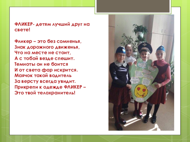 ФЛИКЕР- детям лучший друг на свете!Фликер – это без сомненья,Знак дорожного движенья,Что на месте не стоит,А с