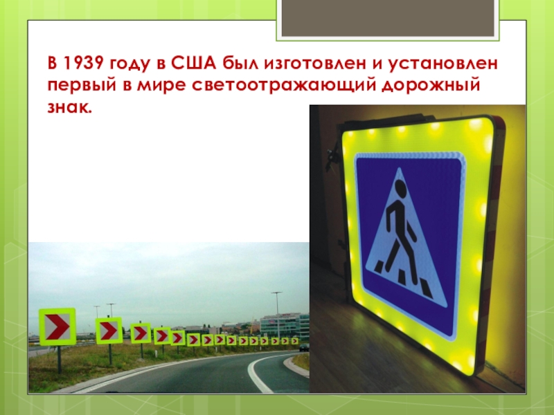 В 1939 году в США был изготовлен и установлен первый в мире светоотражающий дорожный знак.