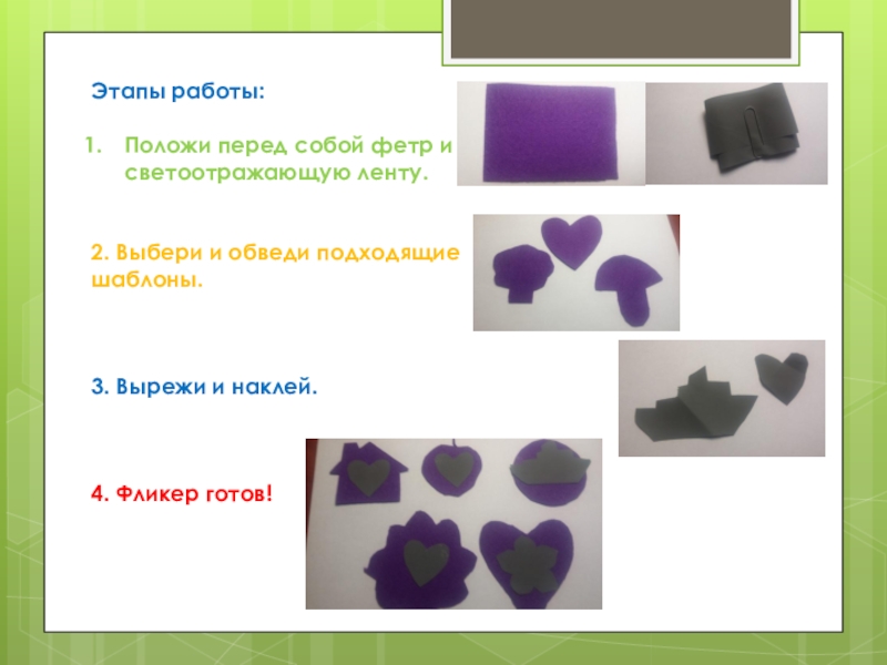 Этапы работы:Положи перед собой фетр и светоотражающую ленту.2. Выбери и обведи подходящие шаблоны. 3. Вырежи и наклей.4.