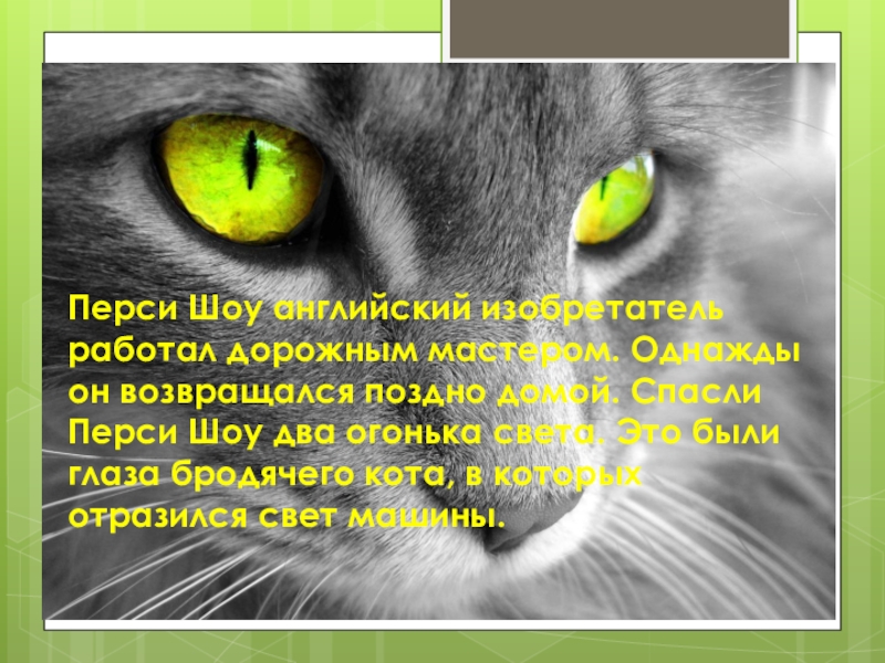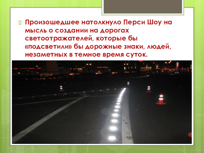 Слайд 10Произошедшее натолкнуло Перси Шоу на мысль о создании на дорогах светоотражателей,