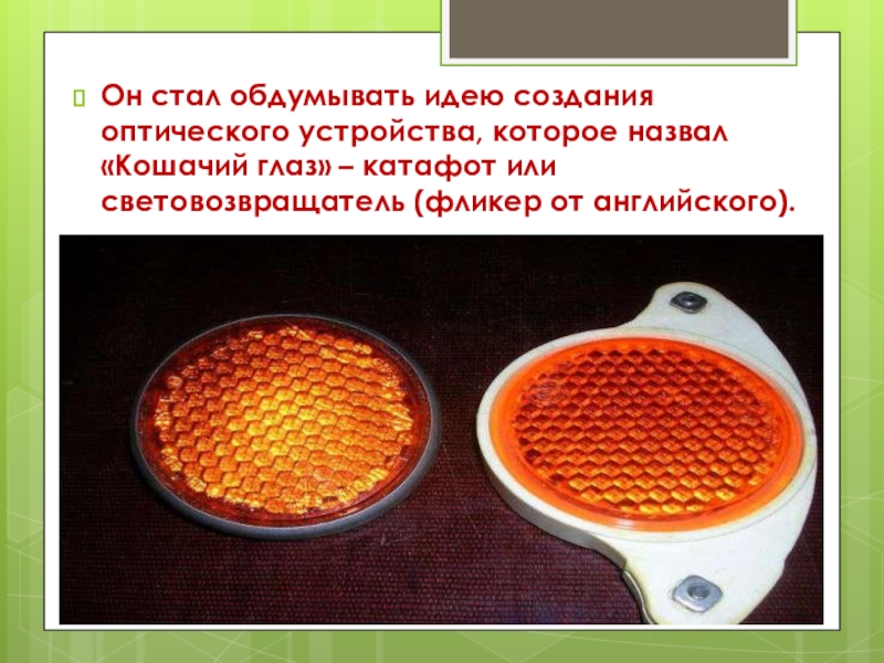 Он стал обдумывать идею создания оптического устройства, которое назвал «Кошачий глаз» – катафот или световозвращатель (фликер от