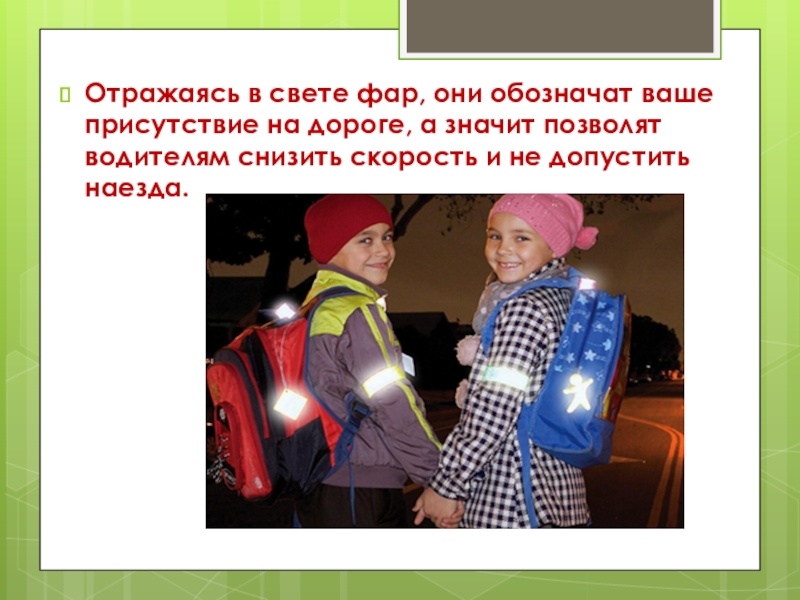 Слайд 7Отражаясь в свете фар, они обозначат ваше присутствие на дороге, а
