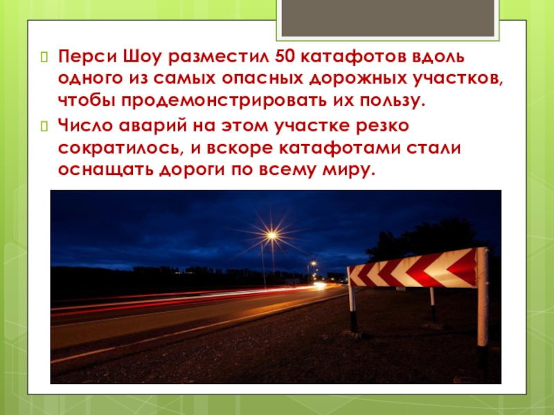 Слайд 12Перси Шоу разместил 50 катафотов вдоль одного из самых опасных дорожных