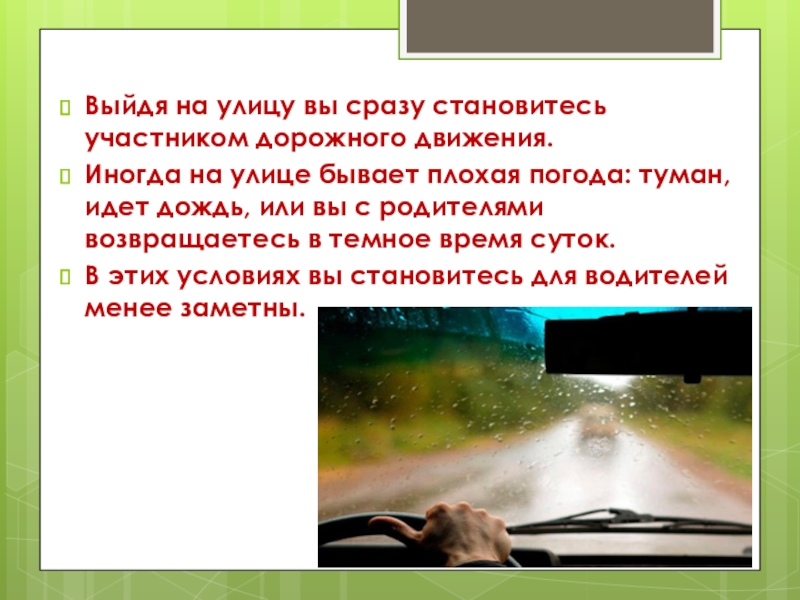 Выйдя на улицу вы сразу становитесь участником дорожного движения. Иногда на улице бывает плохая погода: туман, идет