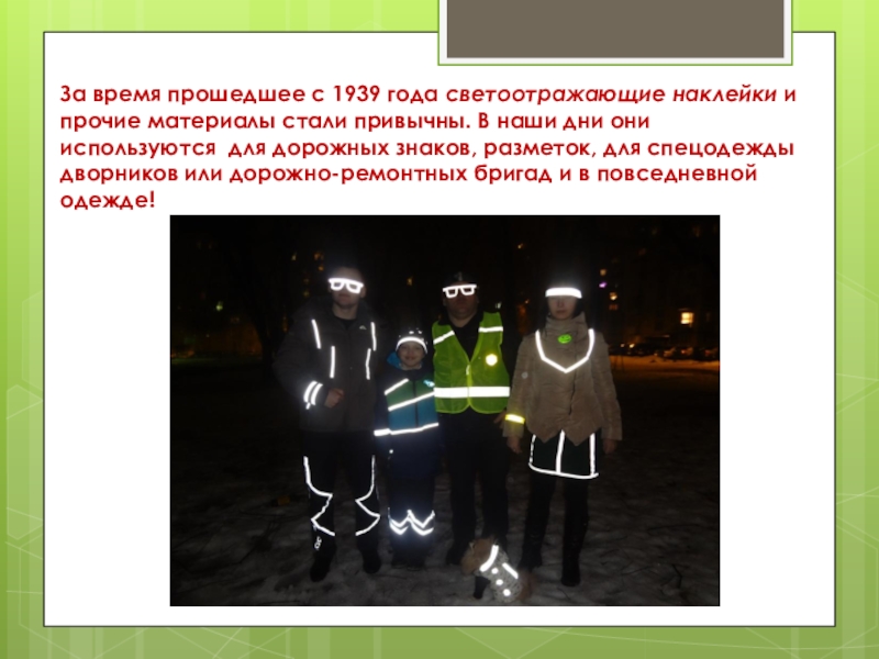 Слайд 14За время прошедшее с 1939 года светоотражающие наклейки и прочие материалы