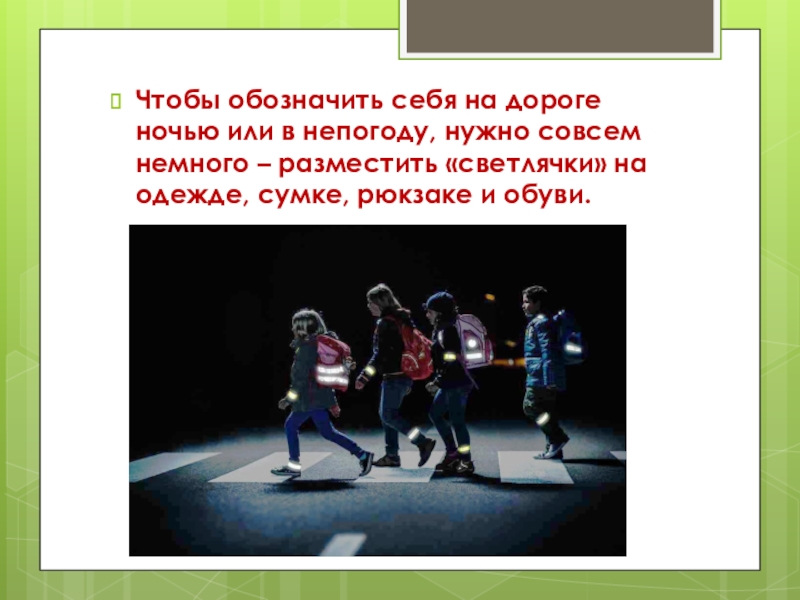 Слайд 6Чтобы обозначить себя на дороге ночью или в непогоду, нужно совсем