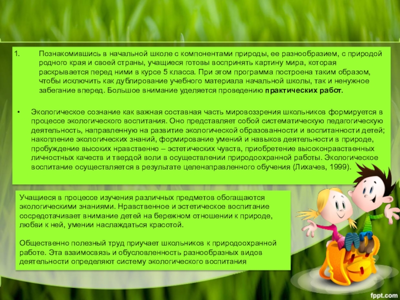 Слайд 10Познакомившись в начальной школе с компонентами природы, ее разнообразием, с природой
