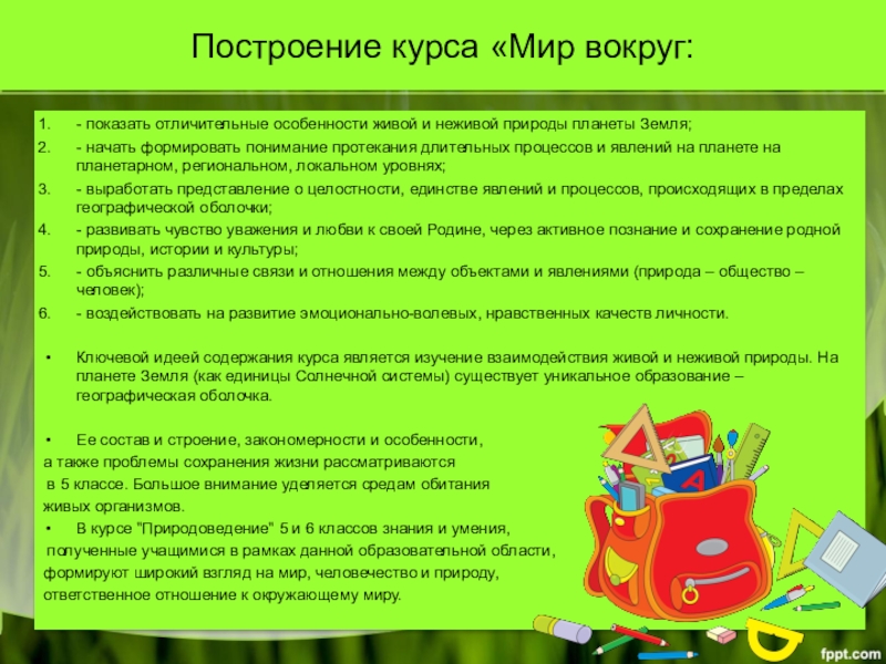 Это реализуется и достигается в курсе предмета благодаря богатству содержания, построенного на основе интегрирования ценностей и основных положений современных естественных наук (физической географии, биологии, физики, химии, астрономии).