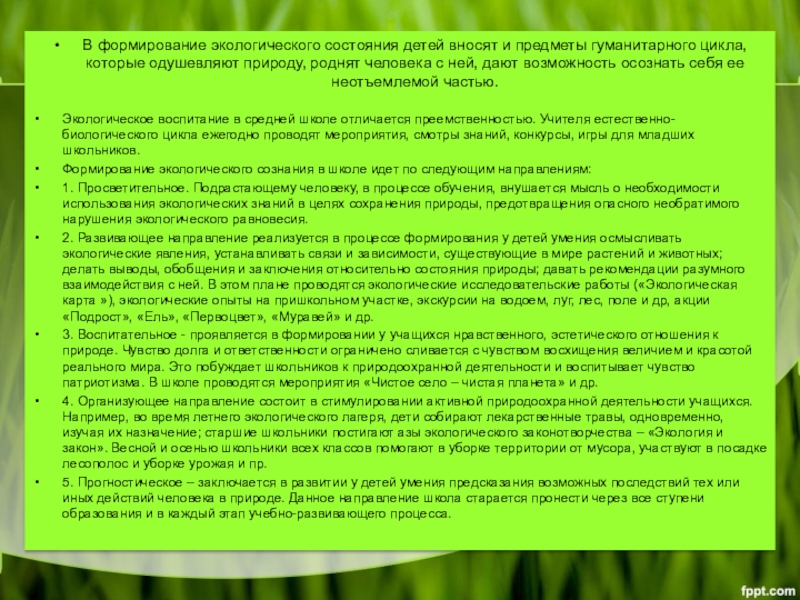 Формирование экологического сознания в школе идет по следующим направлениям: