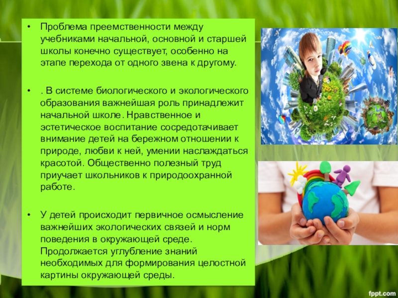 . В системе биологического и экологического образования важнейшая роль принадлежит начальной школе. Нравственное и эстетическое воспитание сосредотачивает внимание детей на бережном отношении к природе, любви к ней, умении наслаждаться красотой. Общественно полезный труд приучает школьников к природоохранной работе.