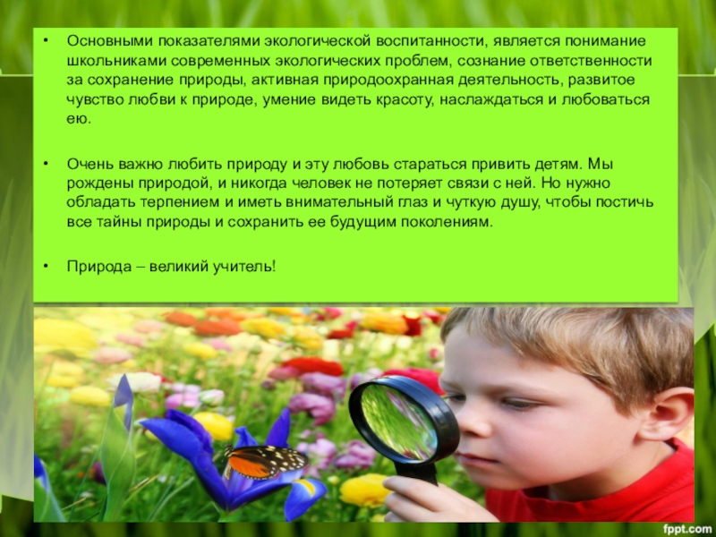 Слайд 13Основными показателями экологической воспитанности, является понимание школьниками современных экологических проблем, сознание