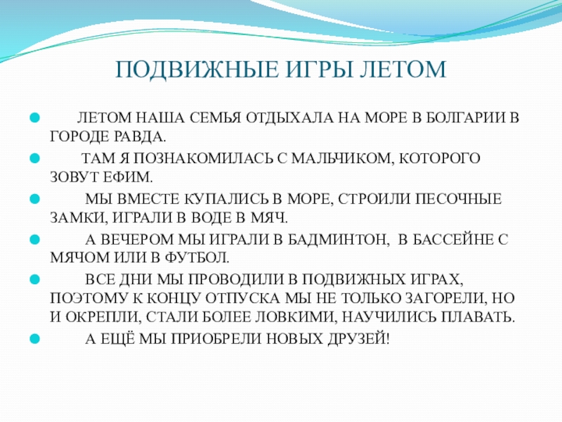 ВСЕ ДНИ МЫ ПРОВОДИЛИ В ПОДВИЖНЫХ ИГРАХ, ПОЭТОМУ К КОНЦУ ОТПУСКА МЫ НЕ ТОЛЬКО ЗАГОРЕЛИ, НО И ОКРЕПЛИ, СТАЛИ БОЛЕЕ ЛОВКИМИ, НАУЧИЛИСЬ ПЛАВАТЬ.