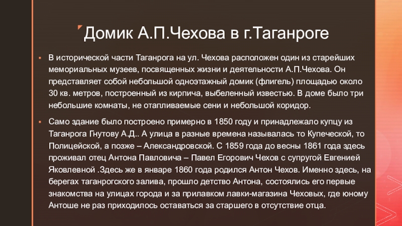 Домик А.П.Чехова в г.ТаганрогеВ исторической части Таганрога на ул. Чехова расположен один из старейших мемориальных музеев, посвященных жизни и деятельности А.П.Чехова. Он представляет собой небольшой одноэтажный домик (флигель) площадью около 30 кв. метров, построенный из кирпича,
