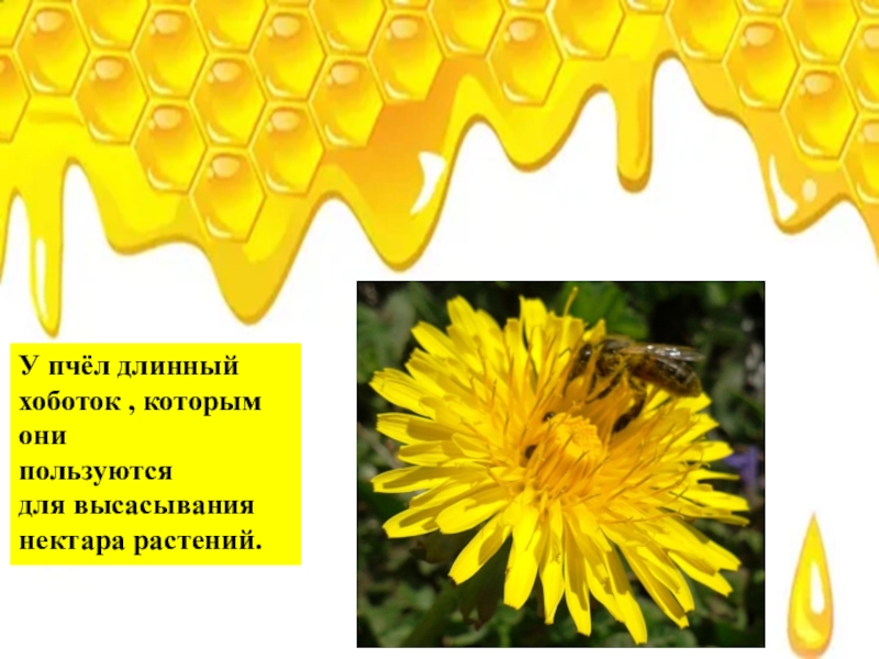 У пчёл длинный  хоботок , которым они пользуются для высасывания нектара растений.