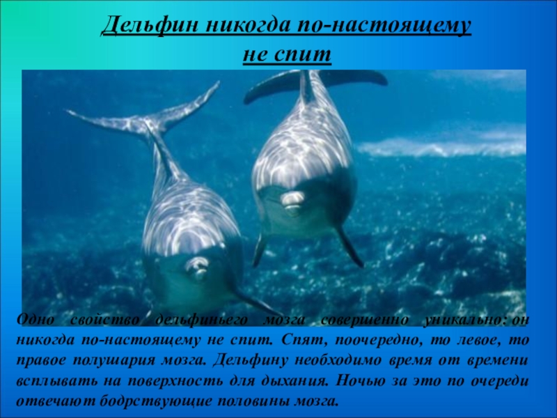 по-настоящему не спит. Спят, поочередно, то левое, то правое полушария мозга. Дельфину необходимо время от времени всплывать на поверхность для дыхания. Ночью за это по очереди отвечают бодрствующие половины мозга.