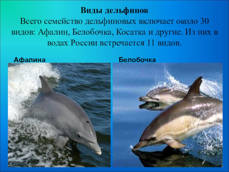 Всего семейство дельфиновых включает около 30 видов: Афалин, Белобочка, Косатка