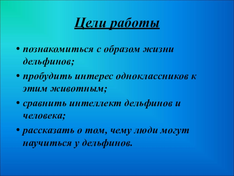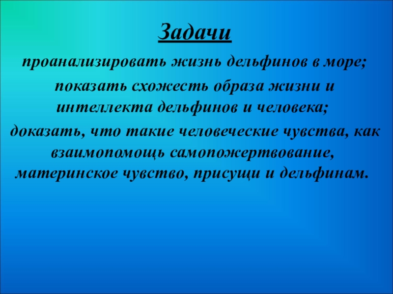 доказать, что такие человеческие чувства, как взаимопомощь самопожертвование, материнское чувство, присущи и дельфинам.