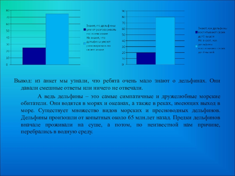 И вот что выяснилось: анкетирование показало, что всего лишь 15 % детей наблюдали за дельфинами, 10% детей знают как дышат дельфины, 25% детей знают, что дельфины умеют разговаривать на своём языке, 20% детей знают, как дельфины воспитывают своих детёнышей, и никто из детей не знает, чему люди могут научиться у дельфинов.